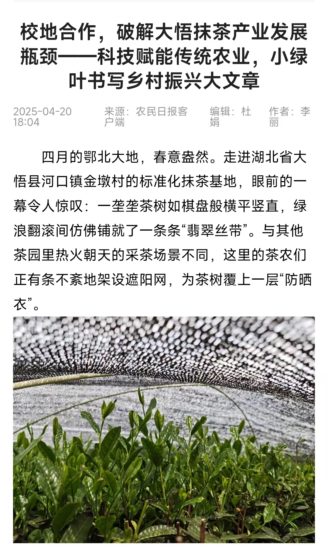 4月20日,《农民日报》以《校地合作,破解大悟抹茶产业发展瓶颈——科技赋能传统农业,小绿叶书写乡村振兴大文章》为题,报道我校第十三批“博士服务团”成员、生命科学学院高级实验师牛蒙亮发挥自身专业特长服务大悟抹茶产业发展的事迹。