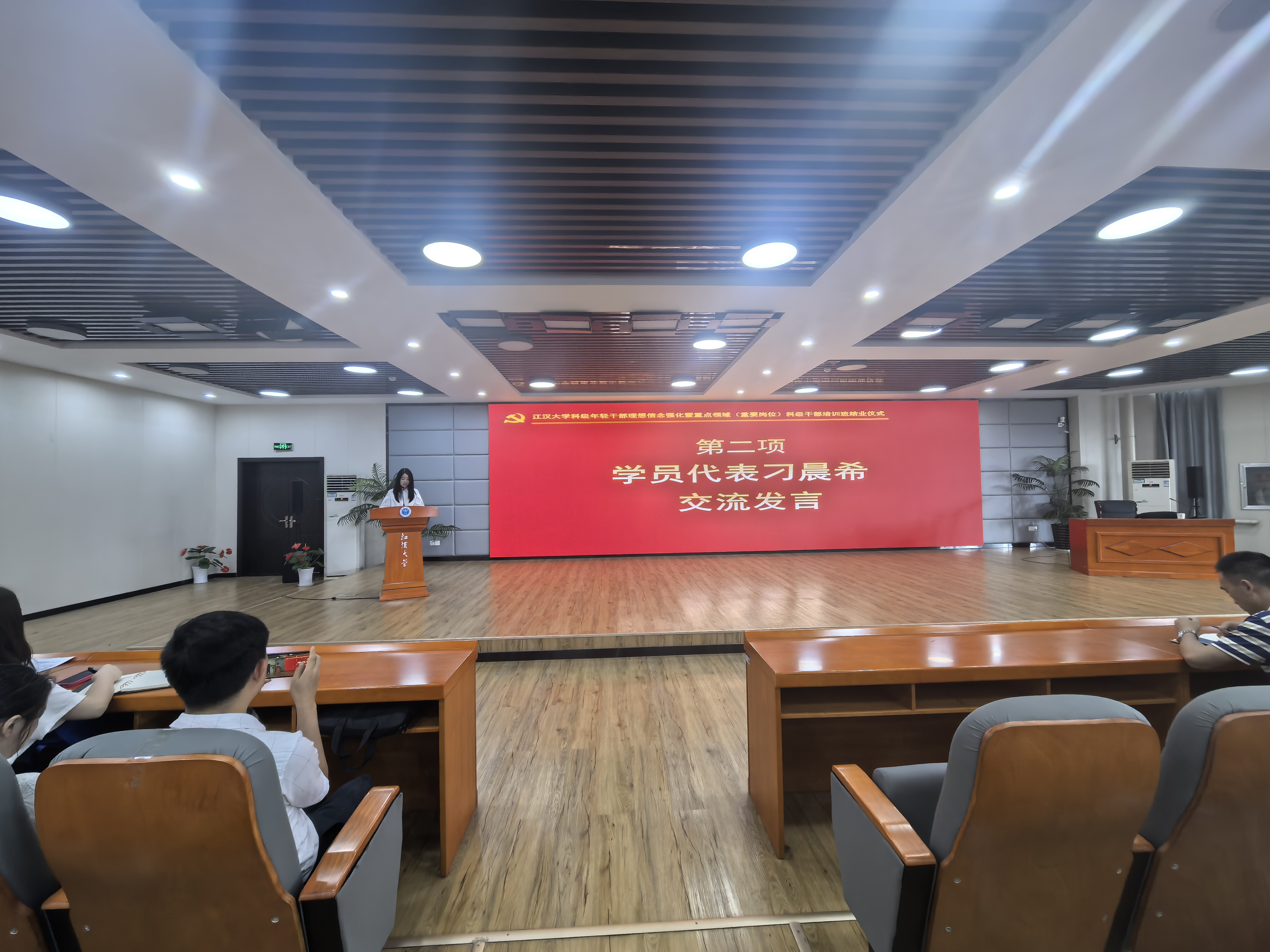 5月19日结业式上,后勤服务保障中心(后勤集团)办公室主任米国伟汇报了重点领域(重要岗位)学员小组研讨交流情况,人文学院学生工作办公室主任刁晨希作为“90后”学员代表作交流发言。